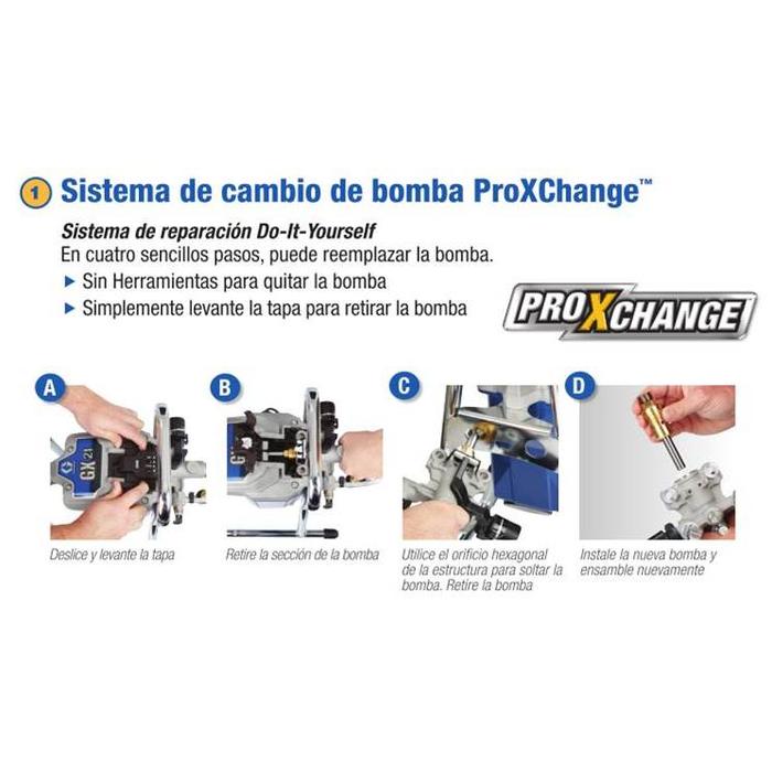 • El GX21 tiene un diseño de su estructura que facilita su transporte, además de estar equipado con el sistema de Graco ProXChange Pump para el reemplazo de la bomba en el puesto de trabajo en minutos