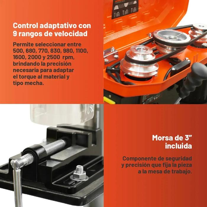• Equipado con un motor de 500W de alto torque y un sistema de 9 velocidades regulables (500 a 2500RPM), permite adaptar la fuerza de corte a la exigencia de cada pieza, asegurando perforaciones perpendiculares exactas y prolongando la vida útil de las mechas