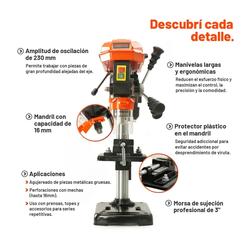 • Su arquitectura con columna de 46MM y mesa ajustable conforma una base estable para perforaciones perpendiculares precisas